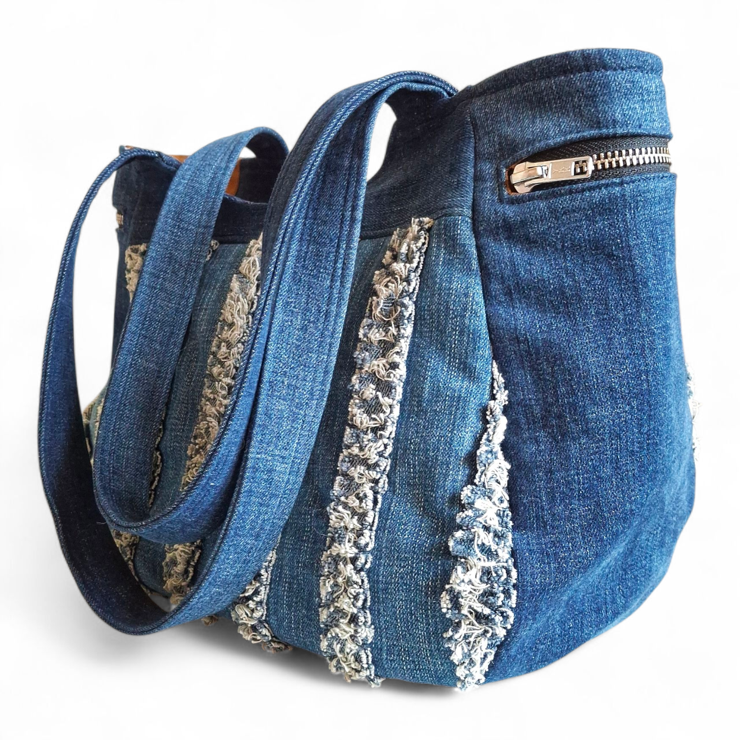 - Buitenzijde: hergebruikte blauwe denim